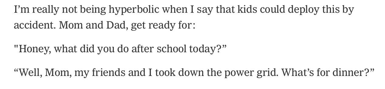 1. Where Tom Fridman worried in his Times column yesterday about kids accidentally blowing up the power grid…