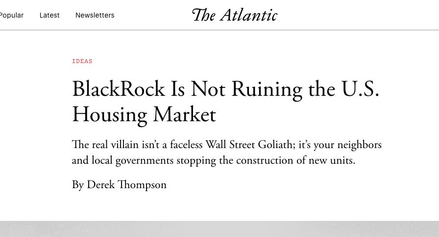 On BIG, we got into a fight with Abundance co-author Derek Thompson, over the specific case of housing in Dallas. The passion is real, and exists for a reason. Here’s Thompson in 2021 calling allegations of private equity control of housing leading to higher prices something close to a conspiracy theory.