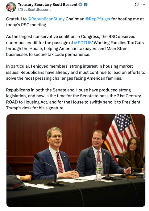 And finally, when Speaker Mike Johnson asked the President about whether he should push to pass the law in the House, sources claim that the President said “no one gives a fuck about housing.” I don’t know if that’s true. Trump may have said it, he also changes his mind a lot.