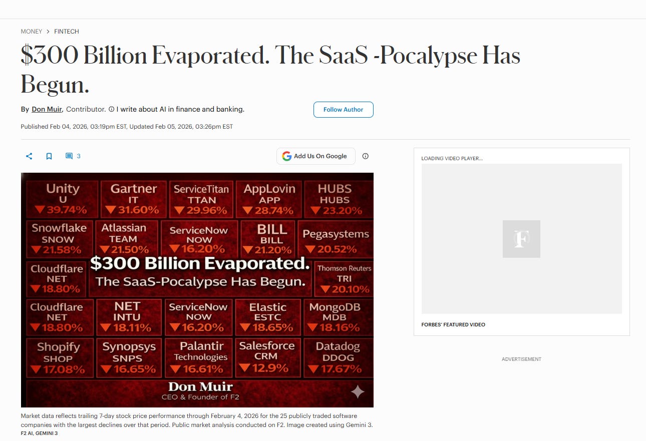 Then, just two days ago, February 4th, SaaS stocks crashed. Forbes declared “The SaaS-Pocalypse Has Begun.” $300 billion evaporated from the stock market. Why? This crash was triggered by Anthropic’s release of 11 open-source Claude plugins for legal/compliance workflows. These agents automate billable-hour tasks, breaking the “seat-based” model that powered SaaS giants. Thomson Reuters dropped 18%, LegalZoom dropped 20%, and the S&P Software Index fell 15%, the worst since 2008.