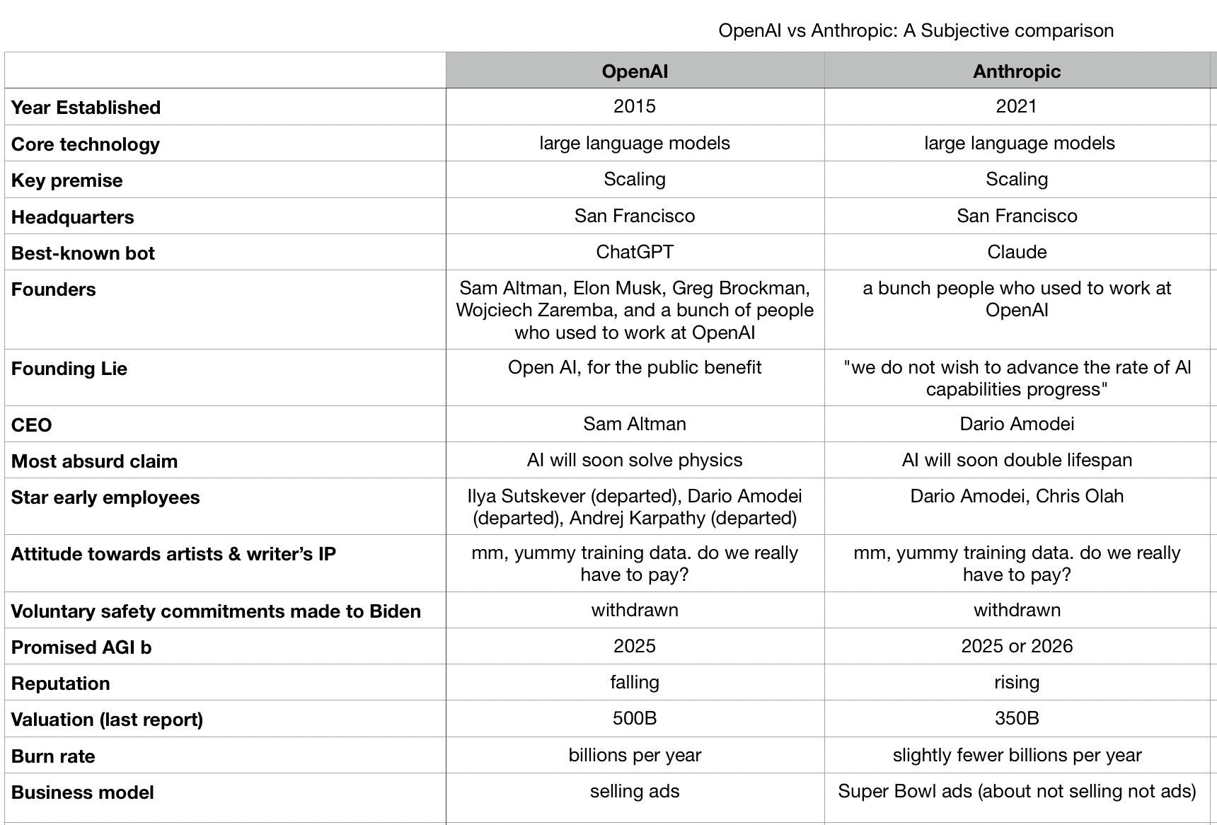 Kidding aside, I do think there are some real differences. OpenAI gave lip service to AI regulation at the US Senate; Anthropic actually supports regulation. And Anthropic is (so far as I can tell) doing a better job of supporting its business customers.