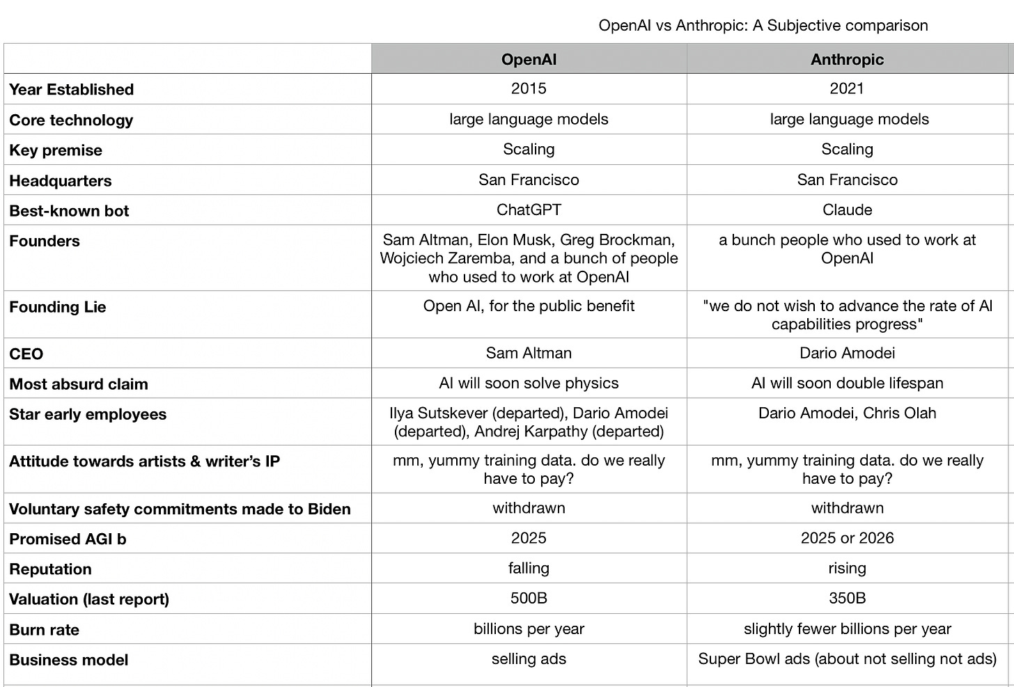 In the Super Bowl spirit, I have outlined today’s match-ups below. As you can see, the two big private LLM companies, although superficially similar, are actually quite different. Or at least I think that’s what you can see? Hmm….