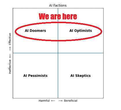 My prediction is that over the course of 2026 we will see a convergence around AI’s effectiveness on the y axis and a divergence of opinion on the x axis, such that people will be increasingly split into optimist factions and doomer factions. Skepticism about the power of the technology will give way to skepticism about the benefit and/or sustainability of the technology.