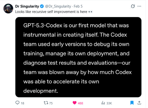 According to OpenAI, GPT 5.3 was “instrumental in creating itself.” It is the first recursively self-improving model. Pause on that for a moment. This is not a marketing claim about AI-assisted coding in general. OpenAI is asserting that their model materially contributed to the engineering of its own successor. If true, this is the first confirmed instance of recursive self-improvement.