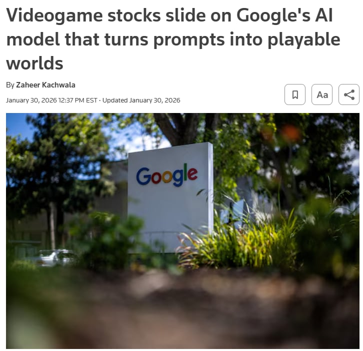 On January 30th, videogame stocks plummeted. Take-Two Interactive (TTWO.O) fell 10%, Roblox (RBLX.N) fell 12%, and Unity Software (U.N.) dropped 21%. Why? Because Google rolled out Project Genie, an AI model capable of creating interactive digital worlds.