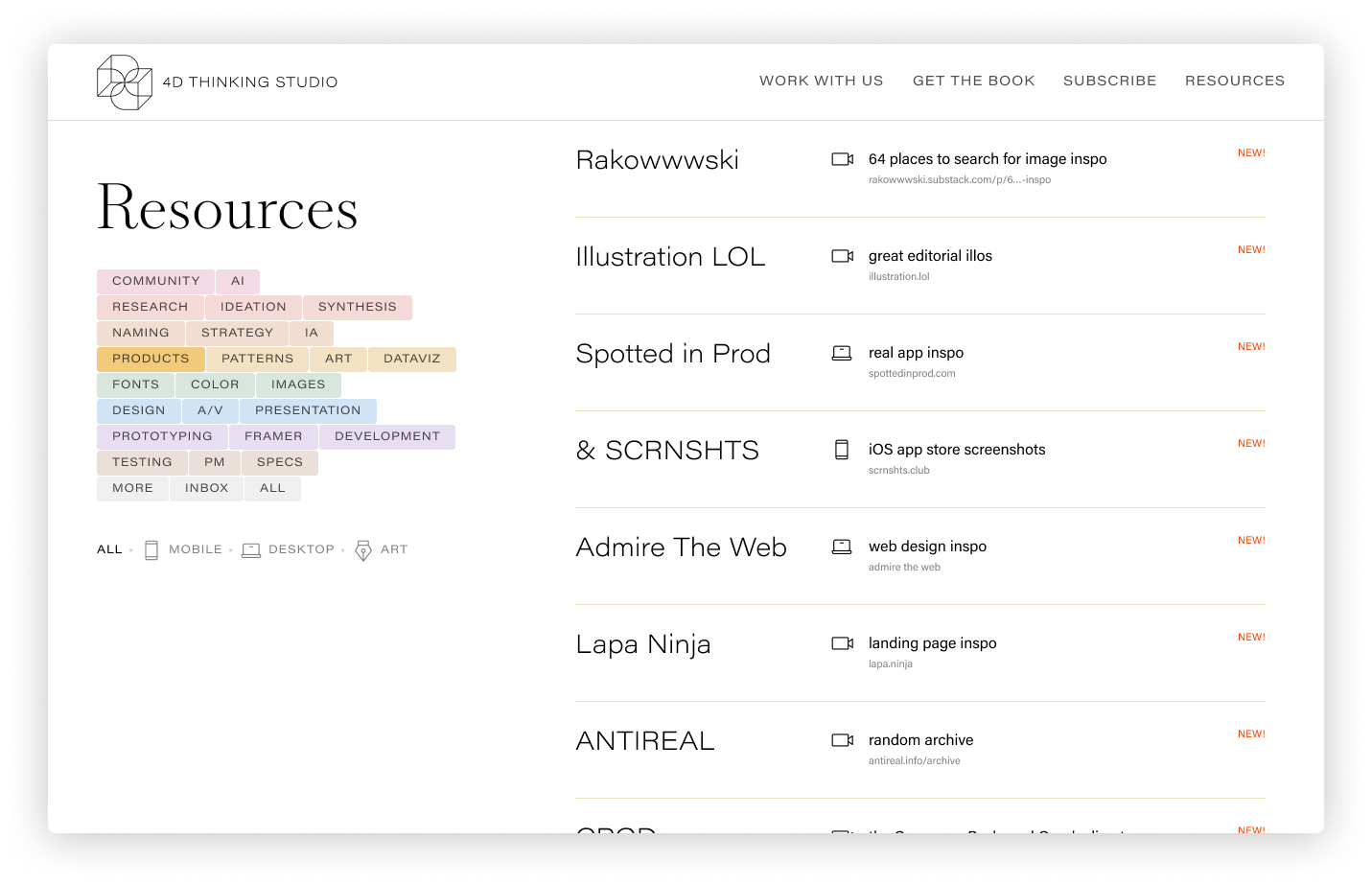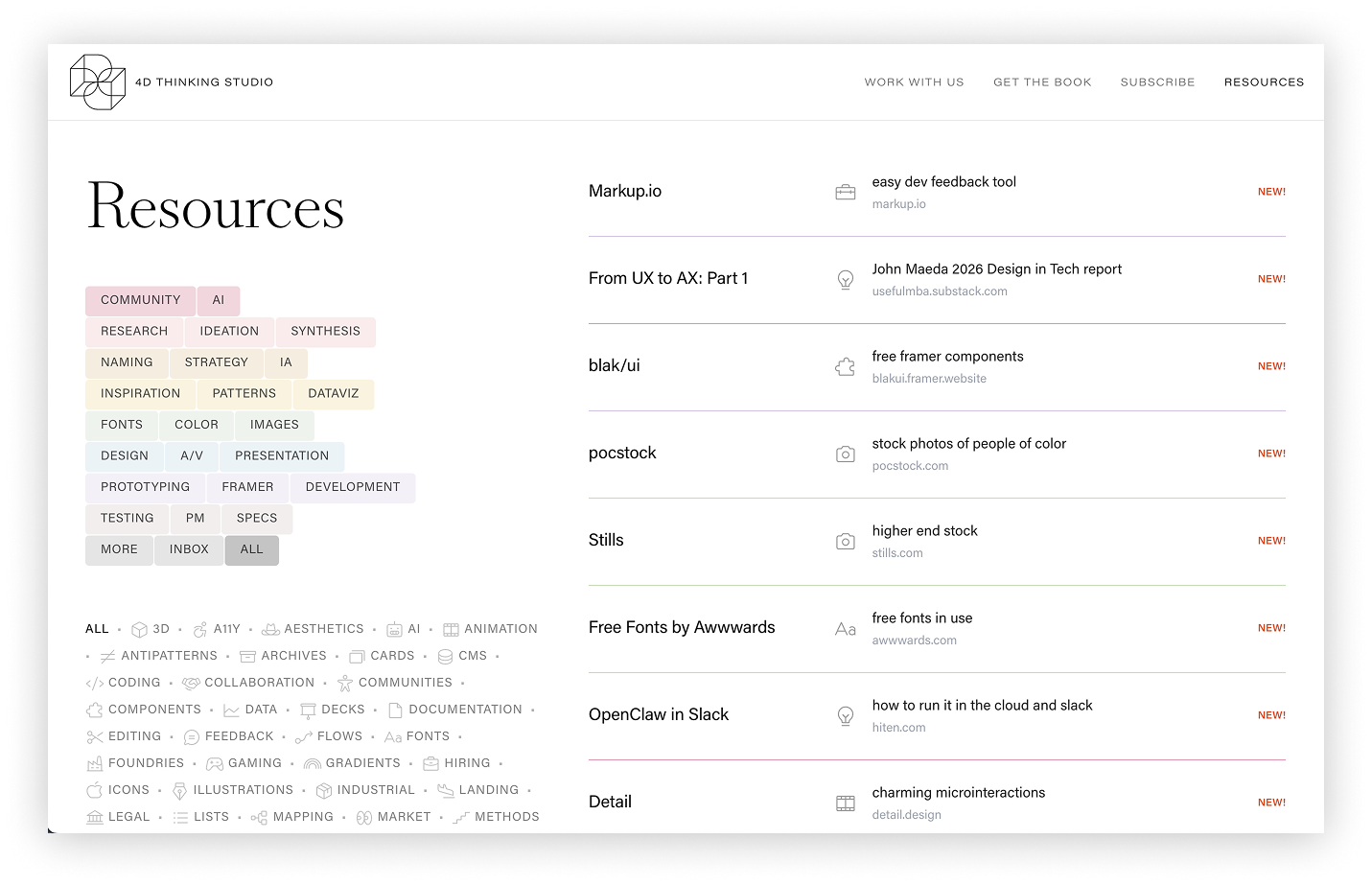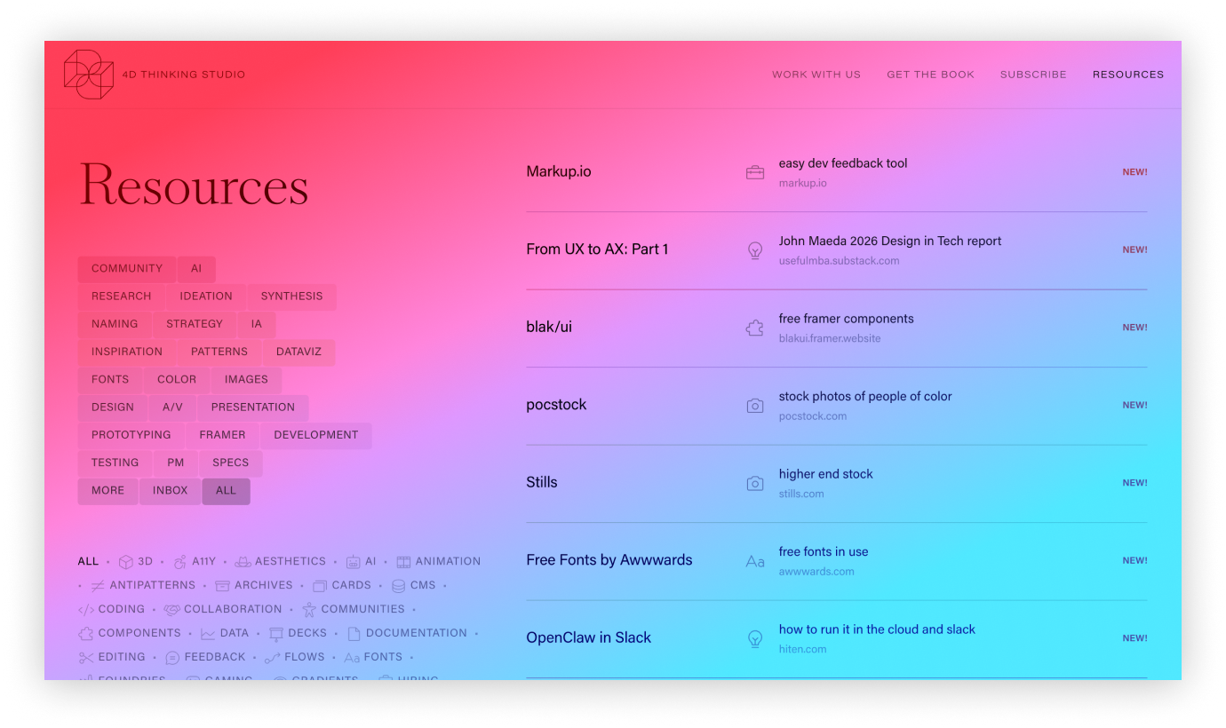 This weekend I used Claude to convert my Notion database of 350+ bookmarks into a resources page on my Framer site (with a Chrome extension to easily add and edit them). There are so many new tips and tools to keep up with, especially with AI changing EVERYTHING, so this is a feed/toolkit of new, favorite, or niche resources. Add it to your own bookmarks: 4Dthinking.studio/resources
