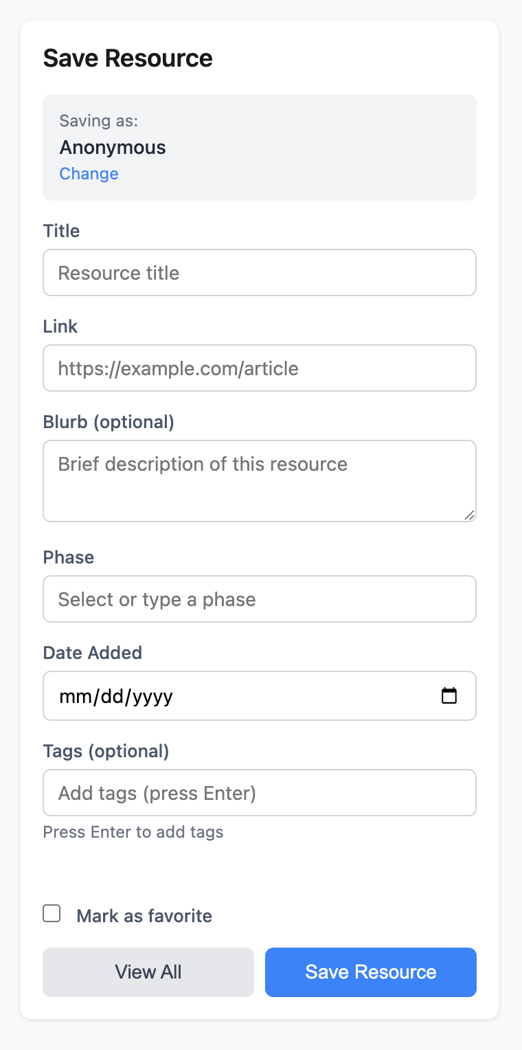 2. ok, can you make the modal have fields for title, blurb, phase, link, date added, and then a checkbox for “fav”? i would like the web interface to be part of my Framer site if that’s possible