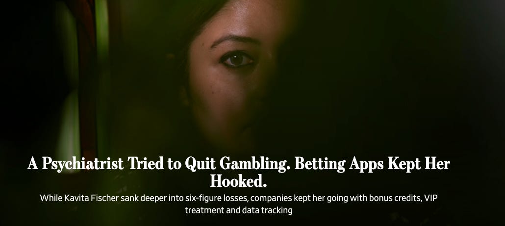Last year, I did an Organized Money episode with Les Bernal and Dr. Kavita Fischer on the problem; Fischer is a psychiatrist who downloaded Draft Kings in 2022 to unwind after putting her kids to bed. She ended up losing $600,000, explaining to the Wall Street Journal the story of how DraftKings used sophisticated techniques to keep her betting, even as she desperately tried to stop. (Most of the loss was not on sports, but on standard casino games.)